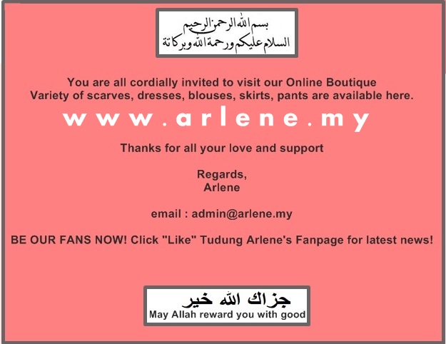 Pelbagai barangan menarik seperti tudung, shawl, dress, baju kurung ada di jual di Arlene Online Shopping. Sila ke www.arlene.my. Kami menerima bayaran melalui Kad Kredit atau 'direct bank transfer dari semua bank .